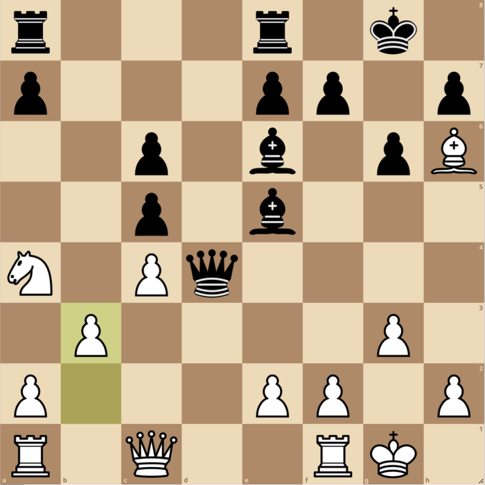 1. Nf3 Nf6 2. g3 g6 3. c4 Bg7 4. Bg2 O-O 5. O-O c5 6. d4 d6 7. dxc5 dxc5 8. Ne5 Nfd7 9. Nd3 Nc6 10. Bxc6 bxc6 11. Qc2 Ne5 12. Nxe5 Bxe5 13. Bh6 Re8 14. Nc3 Qd4 15. Na4 Bf5 16. Qc1 Be6 17. b3 [Diagr]